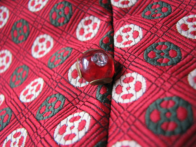It can be challenging to find great vintage pieces to fit every shape, which makes the three dresses below even more special. The first one is a 1970s-era silk brocade frock from Geoffrey Beene‘s Boutique label so you know it’s expertly crafted. The shirtwaist bodice and a-line skirt would be flattering on just about any body shape and the extra-long ascot can be tied in numerous ways. And check out those amazing rhinestone studded buttons! Such great details here, which is to be expected from this vintage boutique label (41″ bust, 34″ waist).