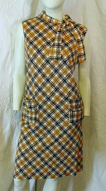 And below the Geoffrey Beene is a vintage 1960s butterscotch and black plaid jersey dress with neck tie (42″ bust, 36″ waist, 41″ hips).