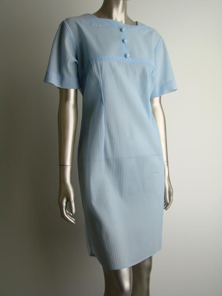 Finally, we have an adorable powder blue mod day dress with a square neckline and decorative buttons (38″ bust, 34″ waist, 40″ hips).