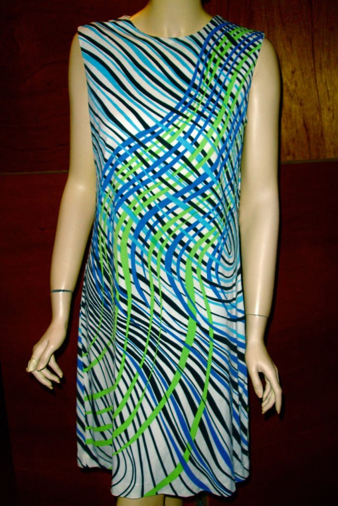 Vintage 1960s to 1970s shift dress with matching coat. The royal blue, sleeveless dress is edged at the neck and armholes with a paler shade of blue. The double-breasted coat combines the two shades of blue in a great geometric pattern. Label check: Original Design by Gina Teresa, 100% Pure Wool, Made in British Hong Kong. $175 on eBay, or make an offer.