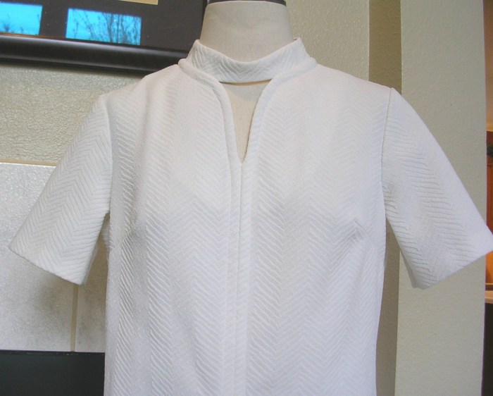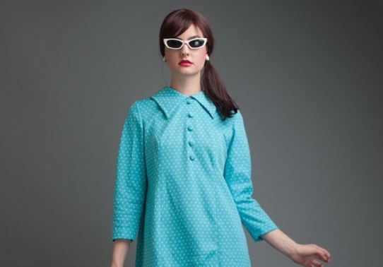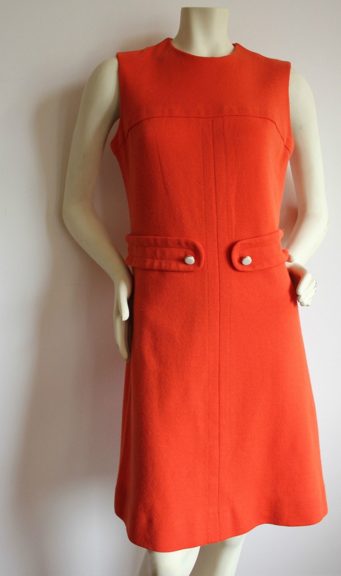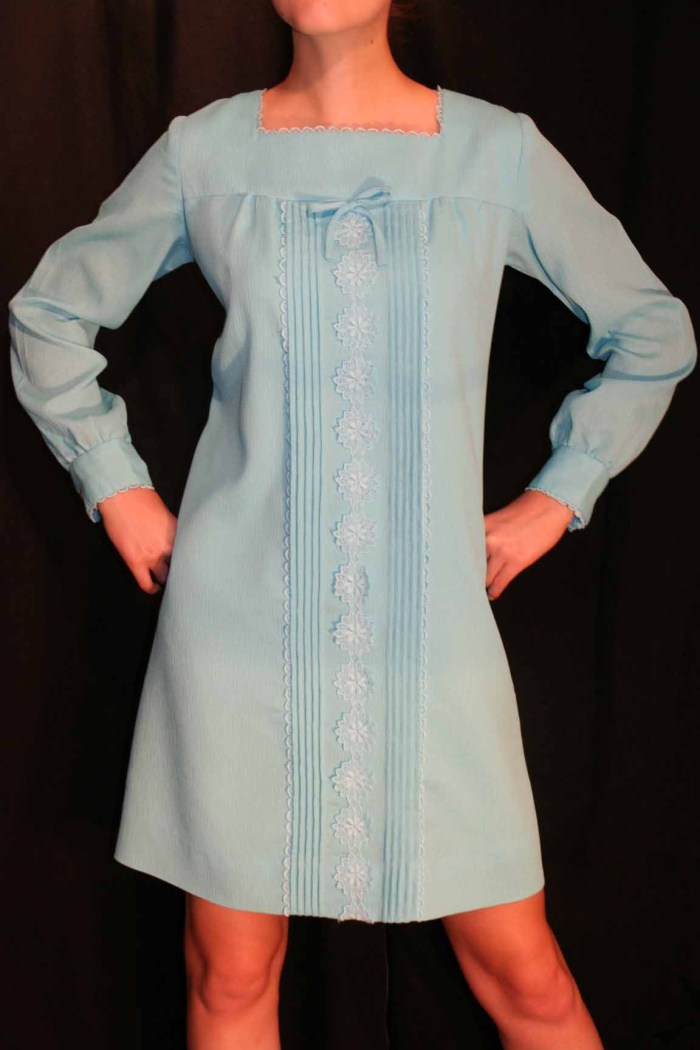 Finally, we have an adorable powder blue mod day dress with a square neckline and decorative buttons (38″ bust, 34″ waist, 40″ hips).