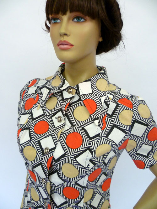 Close up of the above vintage 1970s Lanvin creamy shirt dress in a satiny print from verybestvintage on etsy. $62.
